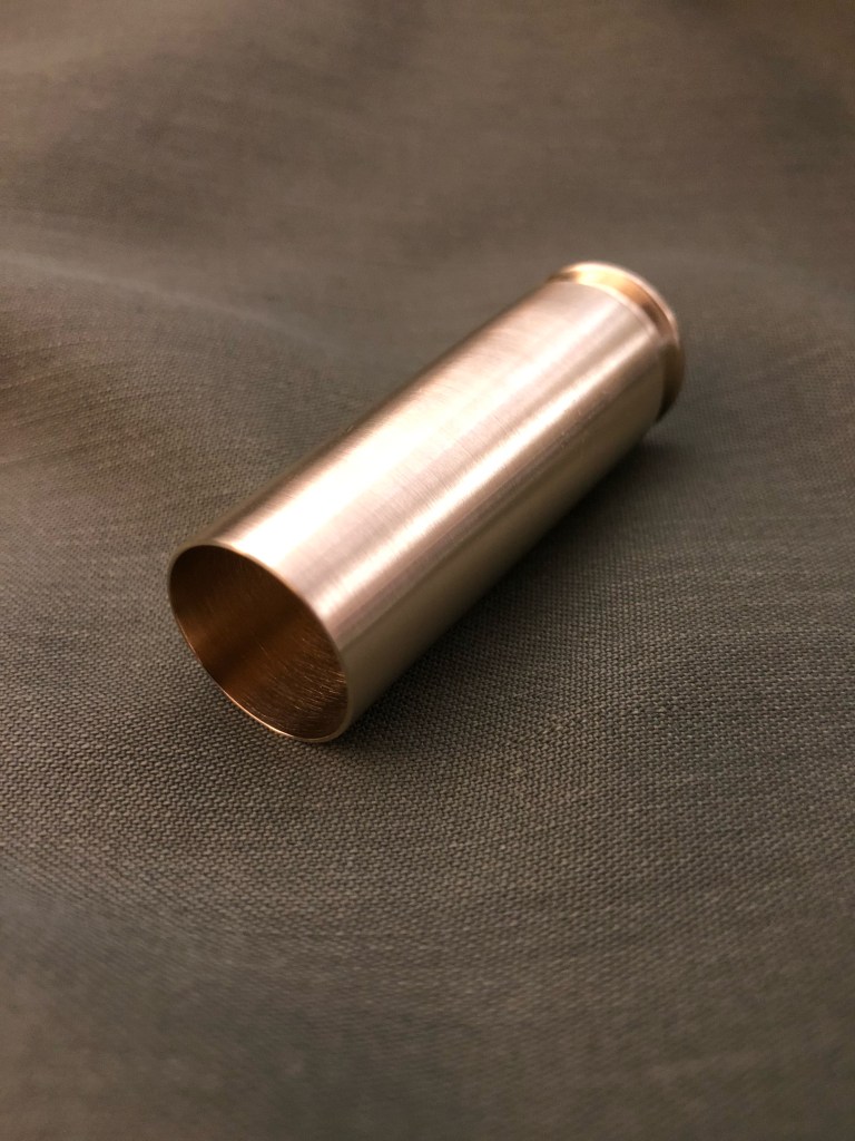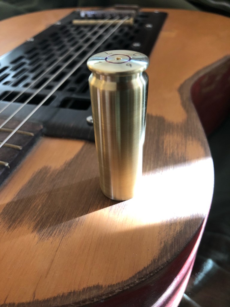 Each Zn61 slide is fabricated from the casing of a spent .50 caliber round. The shell is cut to a 2” playing surface, ground and filed to shape, and then sanded and polished to an appealing finish that will form a rich patina over time (see photo number five for an example of a Zn64 slide that I have been using for the past few months). All edges are filed, sanded and polished for comfort and aesthetics.